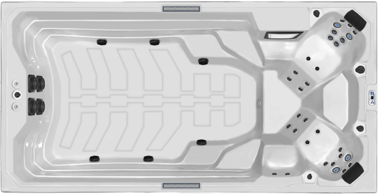 - Двойная гидросистема: 31 массажная форсунка и 2 мощных насоса противотока (2,2 кВт) обеспечивают одновременно нежный массаж и профессиональные условия для плавания